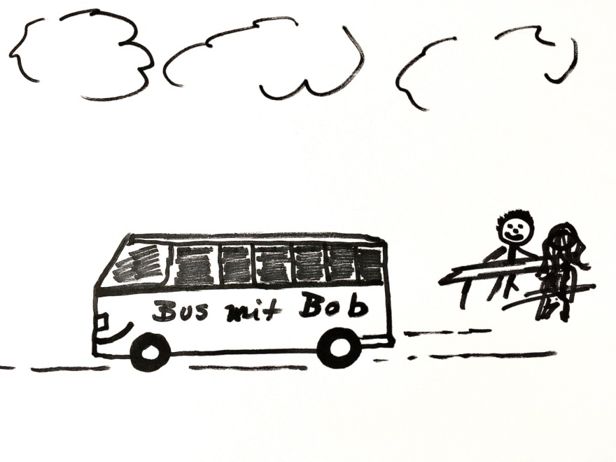 Warum sollte er auch anhalten?.. Der Bus, nicht der Biertisch, der stand ja. Wir tranken was Alkoholfreies und es war nicht das Oktoberfest.